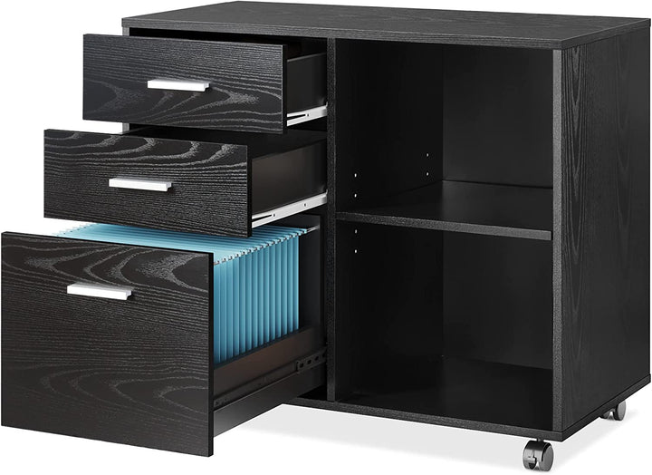 Black 3 Drawer Mobile Lateral Wood File Cabinet With Open Shelves De Devaise